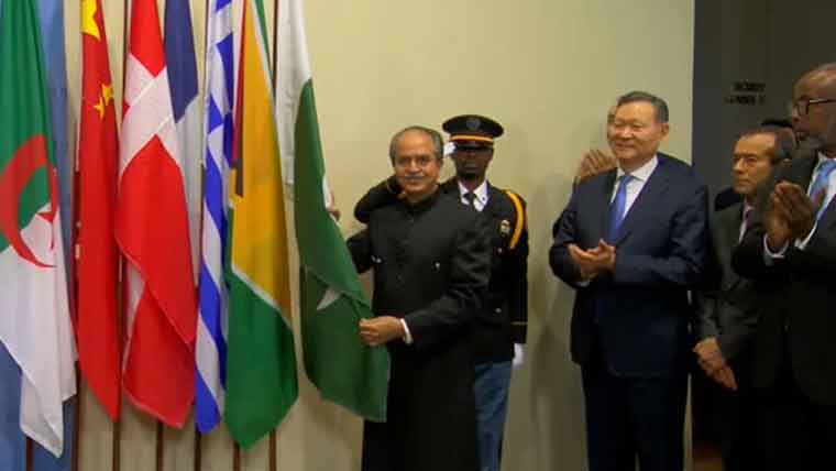 اقوام متحدہ میں سلامتی کونسل کے غیر مستقل ارکان کی ذمہ داریاں سنبھالنے کی تقریب ہوئی، پاکستان کے ایڈیشنل مستقل مندوب عاصم افتخار نے سلامتی کونسل میں پاکستان کا پرچم لگا دیا، پاکستان دو سال تک اپنی ذمے داریاں نبھائے گا، دیگر غیر مستقل ارکان ڈنمارک، یونان، پاناما اور صومالیہ کے پرچم بھی لگائے گئے۔