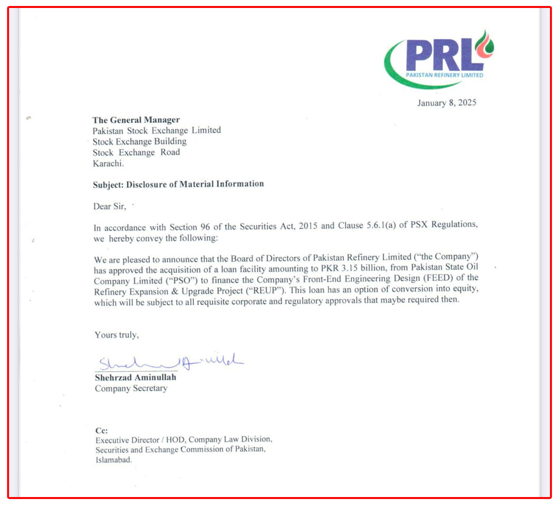 پی آر ایل کی جانب سے لکھے گئے خط میں یہ بھی کہا گیا ہے کہ پی آر ایل بورڈ آف ڈائریکٹرز نے ریفائنری کی توسیع کیلئے قرض کی منظوری دیدی ہے، ریفائنری کی اپ گریڈیشن توانائی کے شعبے میں اہم پیش رفت ہے۔