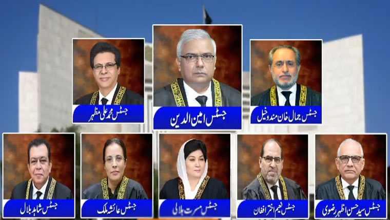 جسٹس امین الدین خان کی سربراہی میں 8 رکنی آئینی بنچ نے 26 ویں آئینی ترمیم کے خلاف درخواستوں پر سماعت کی، جسٹس جمال مندوخیل، جسٹس محمد علی مظہر اور جسٹس عائشہ ملک بنچ میں شامل ہیں، جسٹس حسن اظہر رضوی، جسٹس مسرت ہلالی، جسٹس نعیم اختر افغان اور جسٹس شاہد بلال بھی بنچ کا حصہ ہیں۔